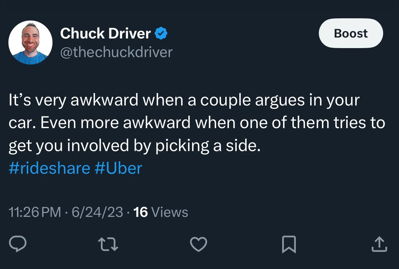 With a firm yet polite demeanor, we have to say, “I’m just here to drive you safely to your destination.” No matter how much we might want to take a side—especially if it’s the side of the person paying for the ride—we have to walk a fine line. After all, our livelihood depends on maintaining good ratings and receiving tips, and we can’t afford to get tangled in someone else’s drama.
