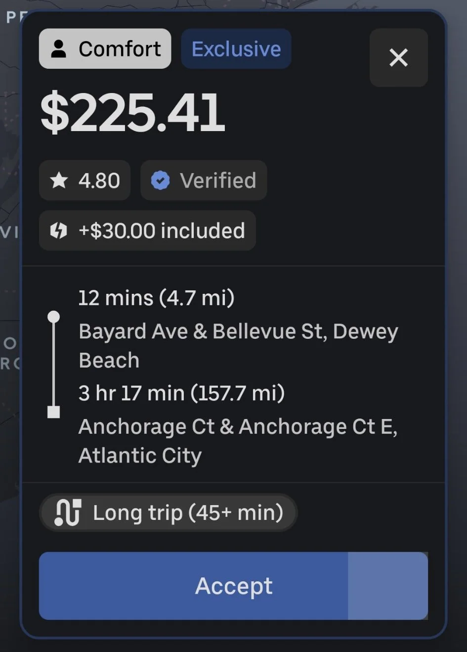 The trip is a hefty 3 hours and 17 minutes, with a fare of $225.41. I only have about 15 minutes to get to the pickup location, leaving me with mere seconds to think. In a moment of spontaneity, I hit “accept” to buy myself some extra time to ponder the logistics.